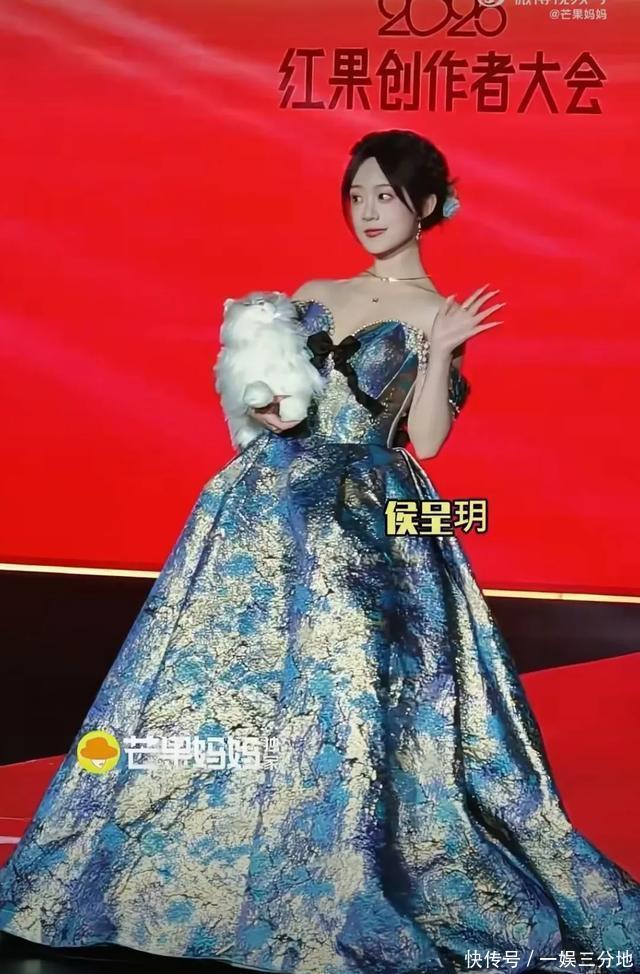 侯呈玥身着一件流光溢彩的抹胸礼服搭配盘发,怀抱一只真实白色猫咪亮相红毯,优雅又灵动。