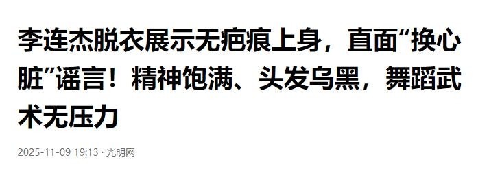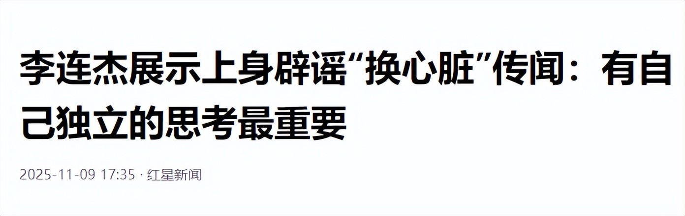 参考资料:红星新闻|李连杰展示上身辟谣“换心脏”传闻:有自己独立的思考最重要 光明网|李连杰脱衣展示无疤痕上身,直面“换心脏”谣言!精神饱满、头发乌黑,舞蹈武术无压力